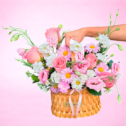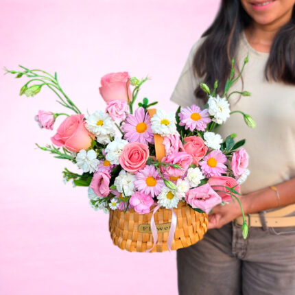 Canasta de 5 rosas, lisianthus, margaritas y fino complemento.