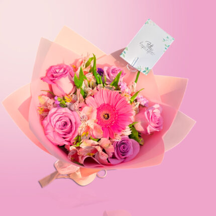 Ramo de 5 rosas lilas, 1 gerberas, alstroemerias, envuelto en fino papel.