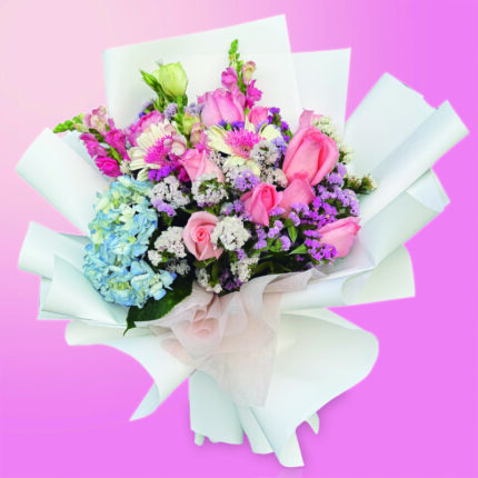 • Ramo floral compuesto por rosas, gypus y astromerias envueltos en papel floral.