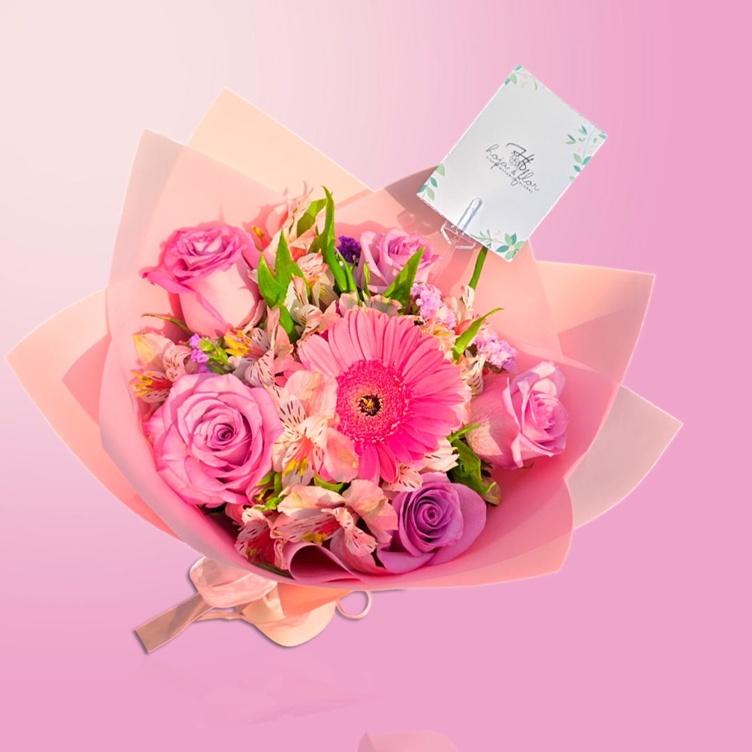 Ramo de 5 rosas lilas, 1 gerberas, alstroemerias, envuelto en fino papel.