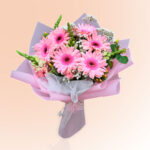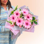 ramo de 6 gerberas rosadas con flores variadas, envuelto en papel koreano.