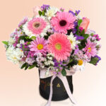 • Box floral compuesta por rosas, minirosas, claveles, flores de dogos y estatice.