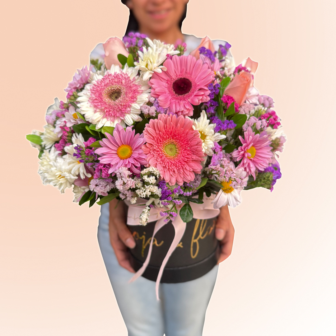 Box de 15 cm x 15 cm. con flores variadas de rosas , gerberas y margaritas