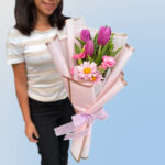 Ramo de 3 tulipanes con flores variadas envueltas en papel.