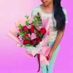 ramo de 12 rosas rojas con claveles y follaje envuelto en papel.