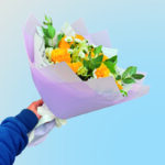 • Ramo floral compuesto por rosas, gypus y astromerias envueltos en papel floral.