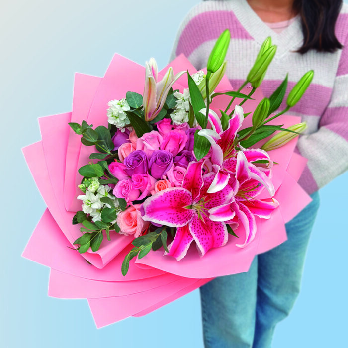 • Ramo de 18 rosas lilas o rosadas acompañadas de gerberas y flores de estatice.