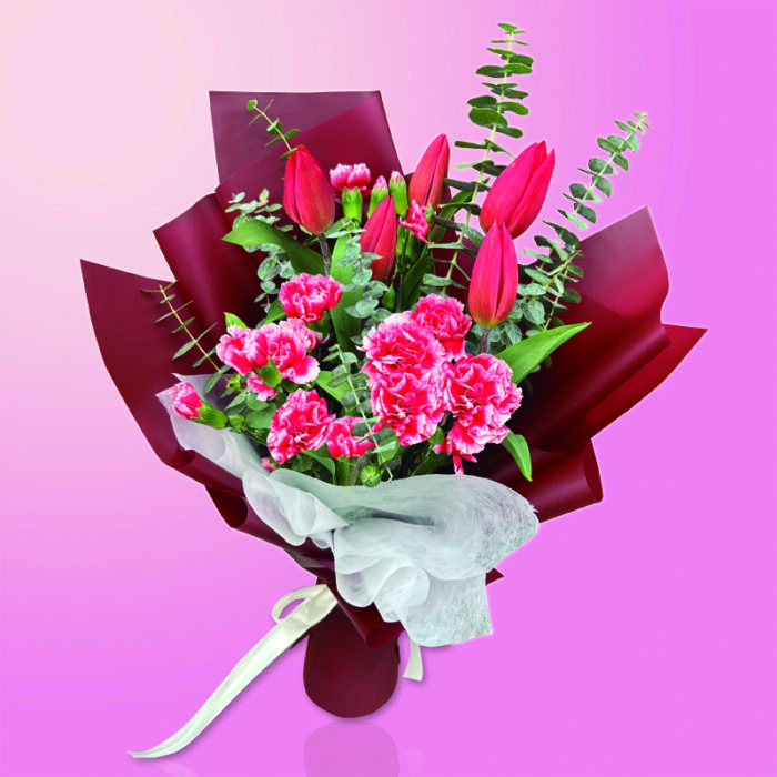 ramo de 5 tulipanes, claveles y eucalipto silver, envuelto en papel.