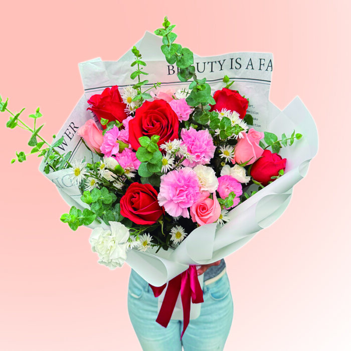 Ramo de 9 rosas, claveles y fino follaje, envuelto en papel.