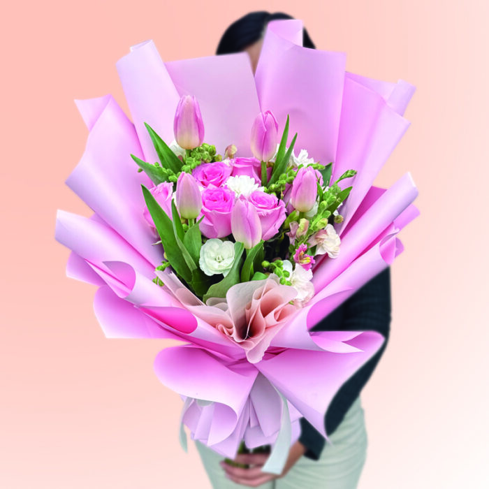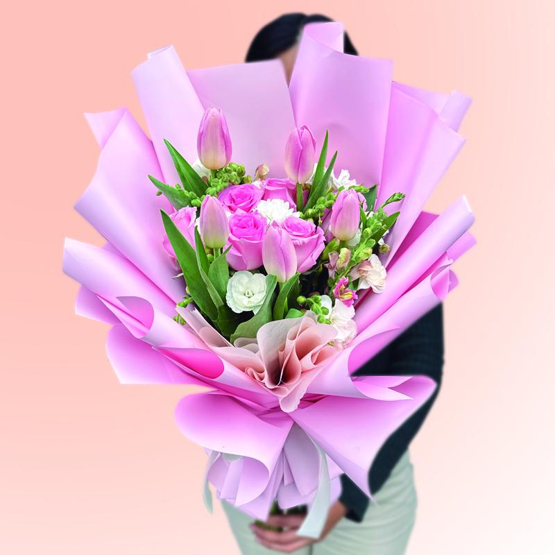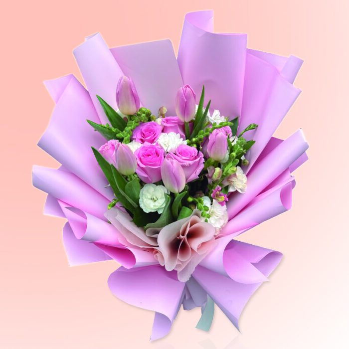 Ramo de 5 tulipanes, 6 rosas, clavel y complemento envuelto en papel.