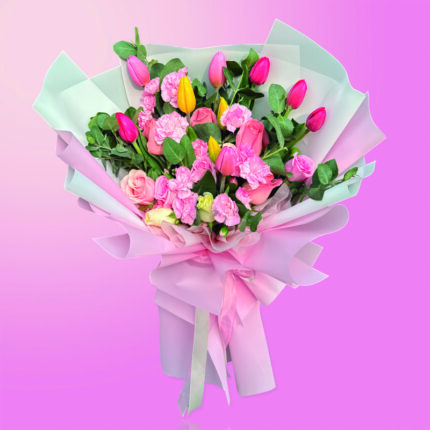 Ramo de 10 tulipanes variados, 12 rosas, claveles y fino follaje envuelto en papel.