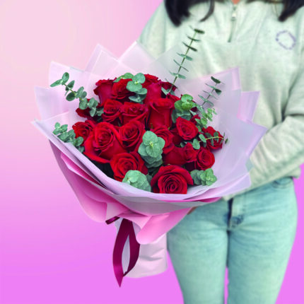 Ramo de 23 rosas rojas con ramitas de eucalipto, envuelto en papel.