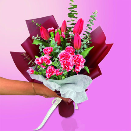 ramo de 5 tulipanes, claveles y eucalipto silver, envuelto en papel.