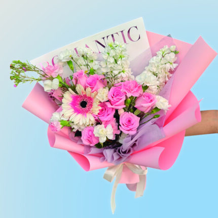 ramo de 9 rosas, 3 gerberas y flores variadas envuelto en papel koreano.